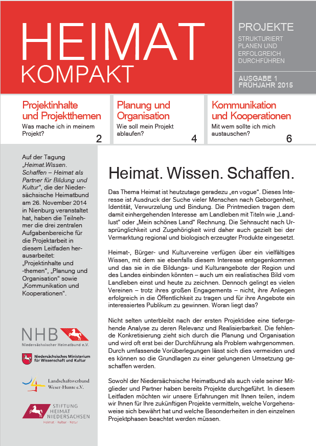 Sowohl der Niedersächsische Heimatbund als auch viele seiner Mitglieder und Partner haben bereits Projekte durchgeführt. In diesem Leitfaden möchten wir unsere Erfahrungen mit Ihnen teilen, indem wir Ihnen für Ihre zukünftigen Projekte vermitteln, welche Vorgehensweise sich bewährt hat und welche Besonderheiten in den einzelnen Projektphasen beachtet werden müssen.