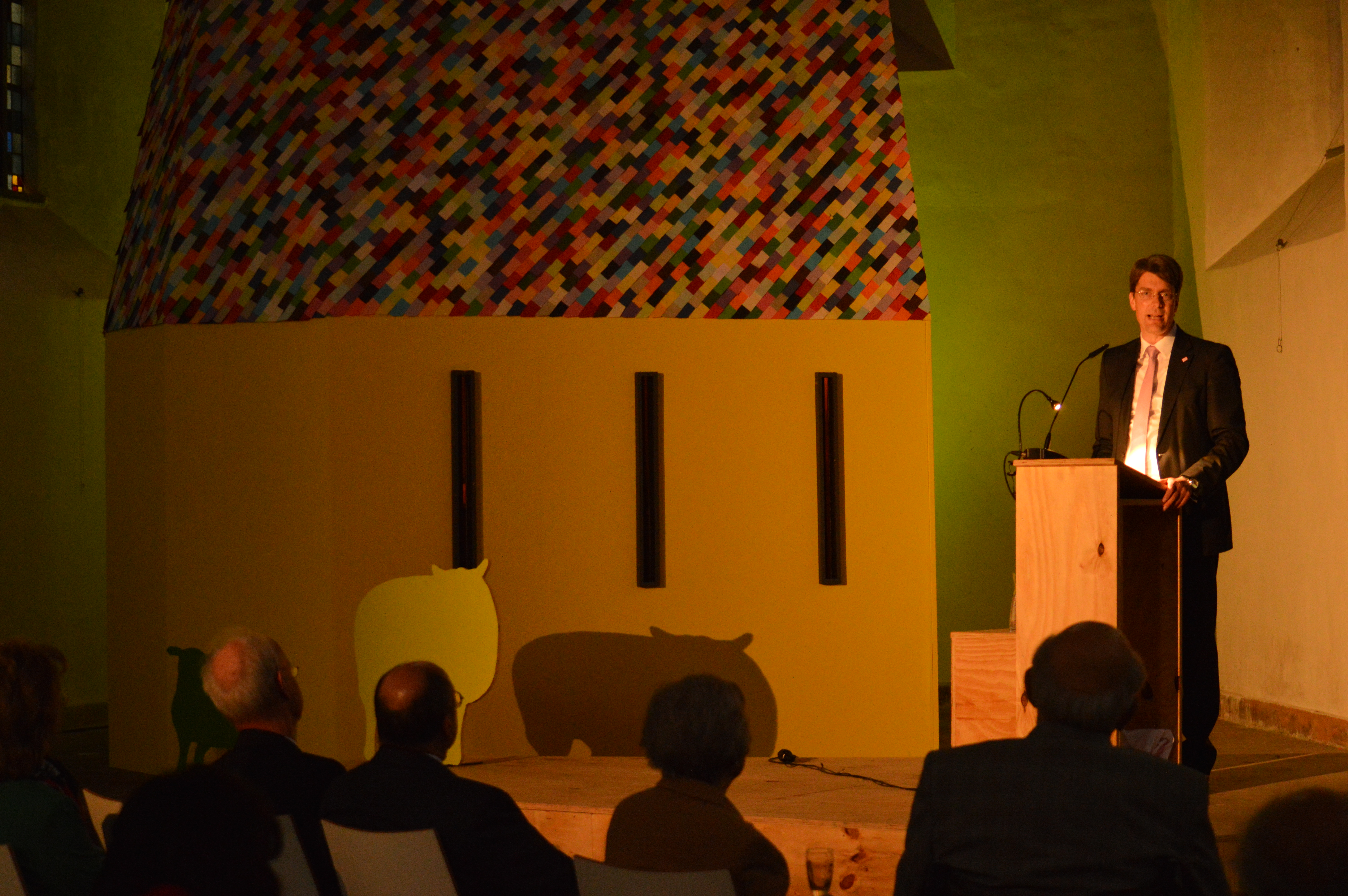 Im vorangehenden ökumenischen Gottesdienst mit dem 71. Bischof von Hildesheim Dr. Heiner Wilmer SCJ und Landessuperintendentin Dr. Petra Bahr hielt Pastorin Bahr eine nachdenkenswerte Predigt über Heimat. Kirchenmusikdirekor Helmut Langenbruch demonstrierte virtuos die Klangfülle der großen Orgel der Michaeliskirche. Die Festversammlung begrüßte NHB-Geschäftsführer Thomas Krueger mit einem kurzen Resümee des Vortages, bevor ein Podiumsgespräch, geleitet durch Dr. Hanns-Eckhardt Dannenberg mit den Gesprächsteilnehmern Landrat Levonen und Oberbürgermeister Dr. Meyer den Festakt einläuteten. Musikalisch begleitet wurde das Prozedere von brillanten Musikern aus Montenegro, Syrien und Iran vom Center of World Music der Universität Hildesheim und dem Global Board des Musikland Niedersachsen.